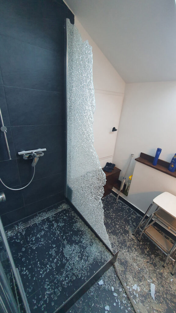 Neulich nach Feierabend wollte ich mir eigentlich eine entspannende Dusche gönnen, doch musste ich mein ursprüngliches Vorhaben zurückstecken, als ich mein Bad unterm Dach zu betreten versuchte. Zuerst fielen mir tausende feinste Glassplitter auf den Bodenfliesen auf und mein Blick ging zunächst besorgt in Richtung Dachfenster, das sich aber schnell als völlig in intakt erwies. Ungläubig stellte ich fest, dass der Grund für die Glitzerpracht auf dem Fußboden wohl von einer halbierten Glaswand der Duschkabine herrührte, die sich wohl in meiner Abwesenheit in ein bizarres, scharfkantiges transparentes Puzzle mit 20.000 Teilen verwandelt hatte.